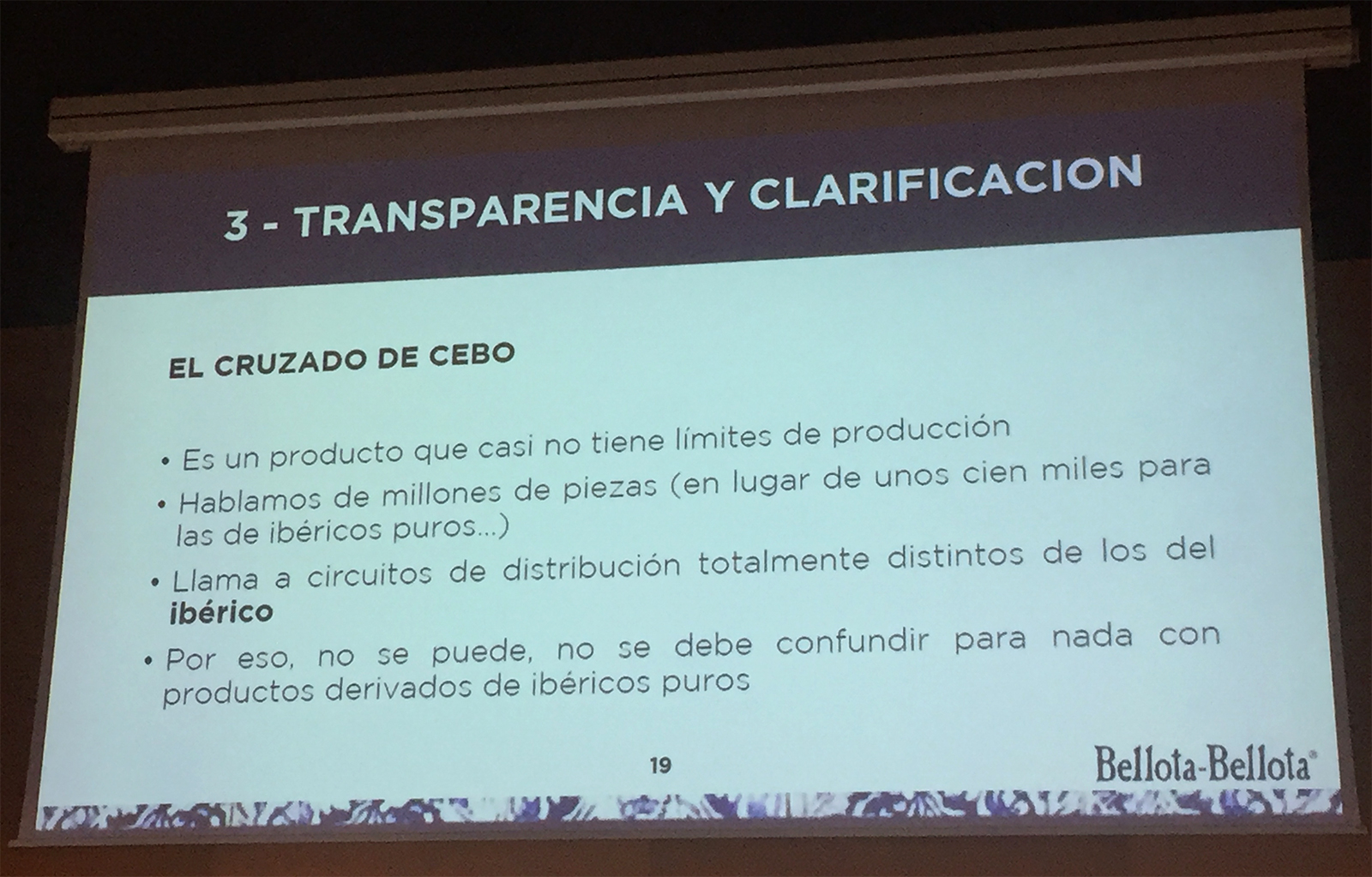 El cruzado de cebo es un producto que casi no tiene límites de producción, hablamos de millones de piezas… es un producto totalmente distinto que debería ir a circuitos de distribución totalmente distintos a los del ibérico. Por lo que no puede confundirse para nada con los otros productos derivados del ibérico puro.