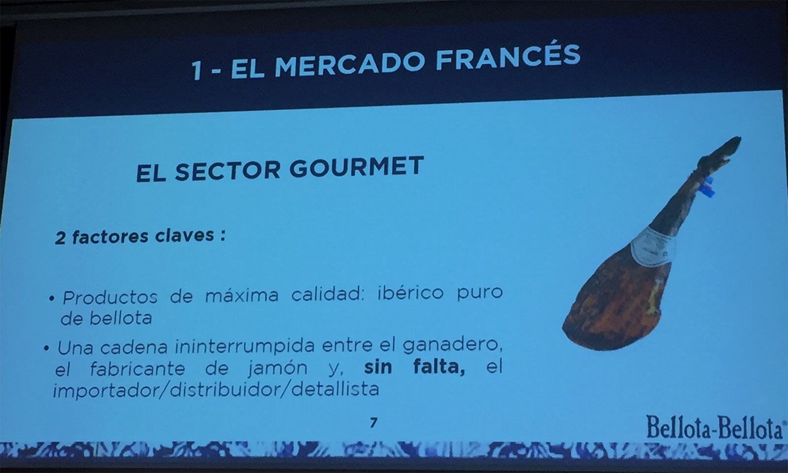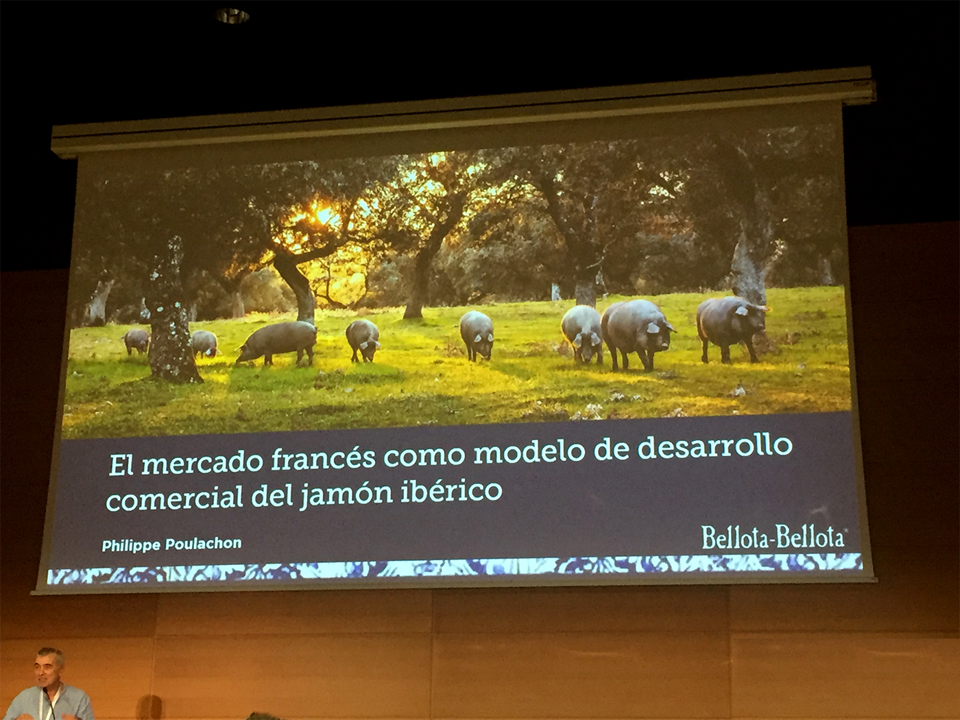 Poulachon comenzó su ponencia diciendo que lo que iba a exponer era su opinión tras llevar trabajando más de 20 años exportando jamón a Francia y siendo el Presidente y Fundador de la empresa Bellota-Bellota, una de las empresas francesas que más jamón exportan al país vecino y que además, exporta a mercados como Hong Kong y Japón.